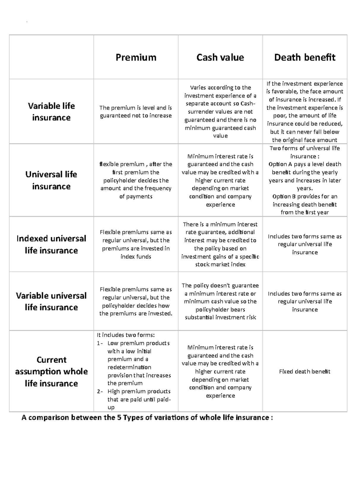 Variations Variation Of Life Insurance Policies Premium Cash Value Death Benefit Variable Life Studocu